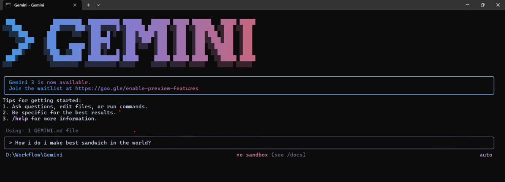 Gemini CLI is Google’s terminal AI tool. It’s FREE (with generous limits) and perfect for getting started with terminal AI.